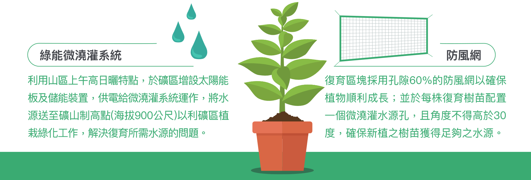 礦區全面實施水土保持,廣植原生樹種如台灣相思樹、楓香、青剛櫟、大葉楠、土肉桂、山毛櫸、台灣赤楊等數十種。並設立溫室育苗系統,供應充裕之苗木植栽於礦山掘跡殘留壁上,加速生態復舊。